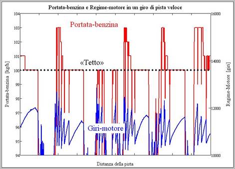 Se si fa uno zoom su un unico tratto della telemetria con portata dell’ordine dei 103 kg/h, si nota che il fuel flow può uscire dai limiti anche prima dei 10.500 giri e che da tale regime è di 3 kg/h superiore, restando sempre a quei livelli mentre il motore sale a 11.000 giri e poi al massimo di oltre 12.500 giri, lungo un rettifilo.