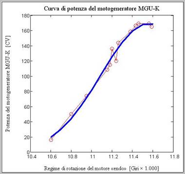 E siccome la curva di potenza più sopra esposta è comprensiva anche dei 163 CV del motogeneratore elettrico MGU-K, la stessa telemetria permette di tracciare anche la curva di potenza del propulsore elettrico, presentata in questo grafico, per completamento di valutazioni.