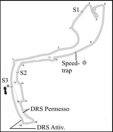 Uno sguardo alla pista di Hockenheim serve a individuare i due punti di attivazione del sistema DRS, dei quali il secondo è il più importante, per il raggiungimento dei 340 orari, con una sistemazione da Speed trap che se fosse stata al culmine avrebbe potuto rivelare anche limiti un po’ più alti. In queste condizioni, i rilievi in S1 sono significativi per la conoscenza delle prestazioni in uscita dalla sequenza delle curve 2, 3 e 4, mentre in S2 si hanno informazioni dopo la veloce ripresa dalla Curva 11 e in S3, sulla linea di traguardo, contano le alte velocità senza ricorsi al DRS.