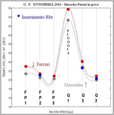 In ogni caso, per la rincorsa ai migliori tempi in prova, è così spiegato, nella forma più semplice e comprensibile, l’andamento dell’efficienza raggiunta sull’Hungaroring, con una baldanzosa posizione della Rbr al cospetto della prevalente Mercedes, pagata vistosamente in resistenza e con una collocazione della Ferrari arretrata, ma non disastrosa, in relazione al citato inconveniente per il miglior tempo in Q3; sconfortante, al contrario, l’allontanamento della Williams, che ha pagato a un prezzo troppo alto le potenze resistenti un po’ accresciute.