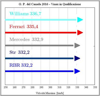 Ed ecco il diagramma delle velocità massime 2016, con una Manor al top, come riprova di potenza Mercedes-Clienti a configurazione scarica: si pensi, a 349,9 con le scie in gara. Quindi, una Mercedes ufficiale che, con quella velocità accoppiata a maggiori potenze resistenti, conferma la graduatoria, assieme alla conquista della Williams. Senza successo per le marche-clienti, per una questione di cavalli e di configurazione aerodinamica. Buona, come indice di potenza, la risultanza della Ferrari e scontata quella della Rbr (345,1 in corsa con le scie), come vettura più deportante in assoluto, che impiega tutta la potenza superflua nella motricità e negli sforzi di trazione, sempre irraggiungibili.