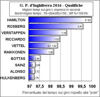 Ancora una volta, è d’ausilio, nell’analisi delle prestazioni da qualifica, il confronto con le risultanze del 2015, relative ai distacchi percentuali dal tempo della pole. La supremazia della Mercedes d’Inghilterra sulla Ferrari, così schiacciante nel 2015, è stata ridotta in questa edizione, scendendo da 1,61% a 0,99%, ma rimane pur sempre inspiegabile alla luce dei cospicui progressi di motore compiuti, se non con le superiori aperture del citato “rubinetto” della potenza.
